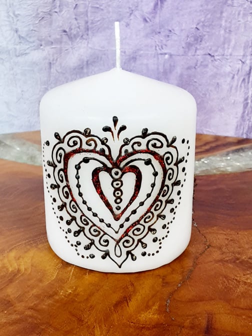 This 3 x 3 Heart pillar candle was hand decorated using henna paste & sealed with wax. The candle will burn for approximately 25 -30 hours, illuminating the design as it burns cleanly down the center. This candle is intended for self love, to gift to someone you love, or for love making. It has red glitter embellishments on the heart.