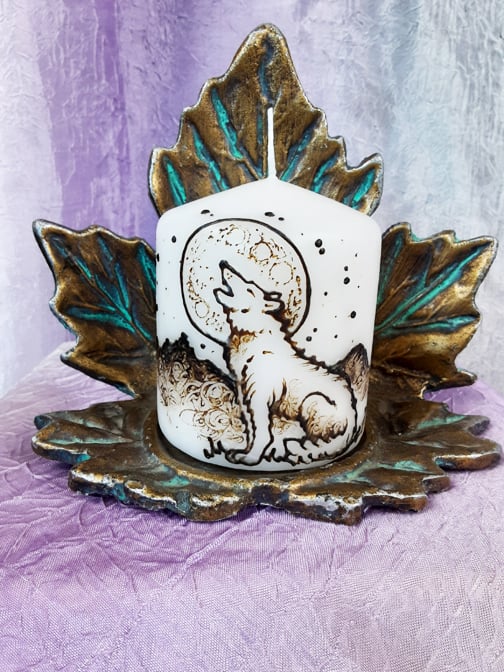 This 3 x 3 Wolf pillar candle was hand decorated using henna paste & sealed with wax. The candle will burn for approximately 25 -30 hours, illuminating the design as it burns cleanly down the center. Light this candle on every full moon & make sure to howl at it.