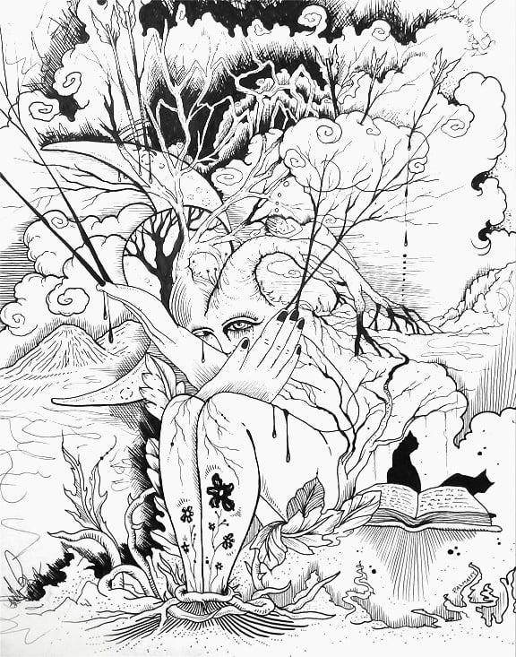9 x 12 original drawing on 100 lb. heavyweight strathmore drawing paper. Drawn with an archival micron pen.