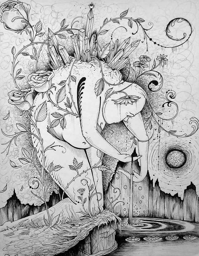 This original drawing was drawn using an archival micron pen on an 80 lb. 11 x 14 sheet of Strathmore drawing paper. Signed by the artist.