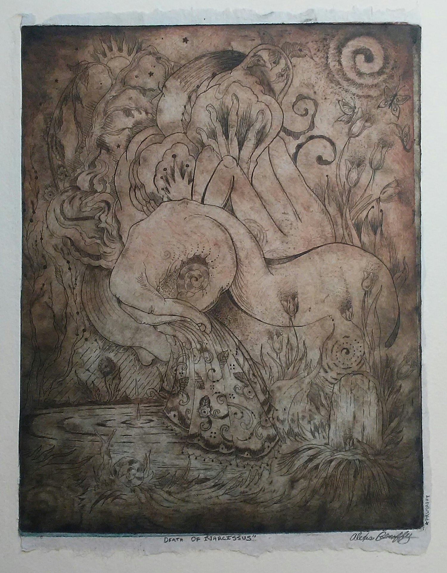 This print references the mythological story of Narcisuss and the idea of reincarnation. Narcissus was a young man who was so in love with his image that he drowned in the very water that held his reflection. The death of the ego is a painful yet necessary process to understand ones purpose in life... and reveals the sensitive emotions that make up our own mortality. This print holds deep meaning about the journey of life, death, and letting go. What does this print bring up for you?