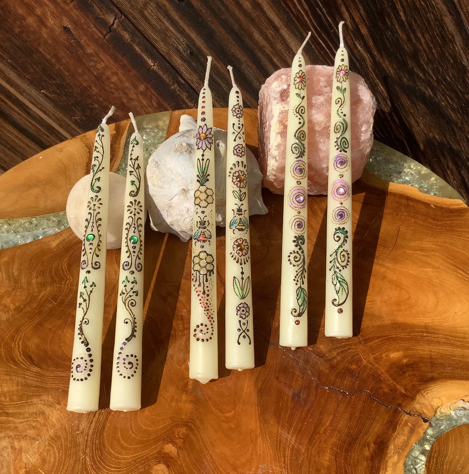 Each taper is hand decorated with Henna magic & Glitter & is sealed with wax by Divine Palm Henna in Santa Fe, New Mexico!